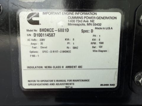 Cummins 8kva/230v electric start diesel generator