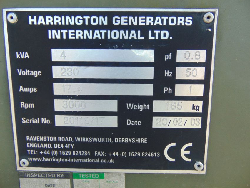 This Harrington 4 kVA, 230V Diesel Generator is direct from the MoD it is sold as seen and has not been tried or tested by us.