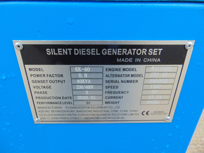 You are bidding on an UNISSUED 40 KVA 3 Phase Silent Diesel Generator Set. This generator is 3 phase 50 Hz.
