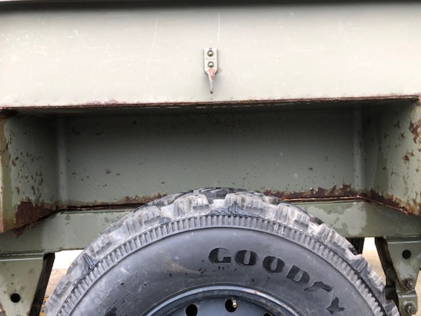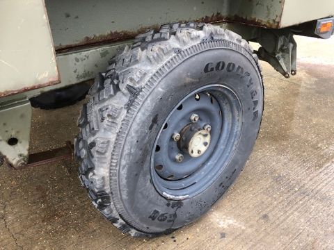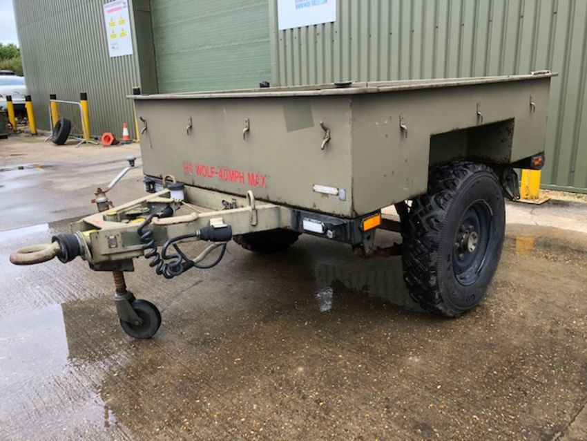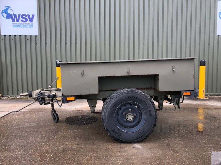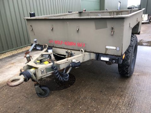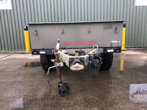 3/4 ton widetrack trailer with dropdown tailgate, military lighting and tow ring, disc brakes, stabliser legs, adjustable and fold away jockey wheel etc.