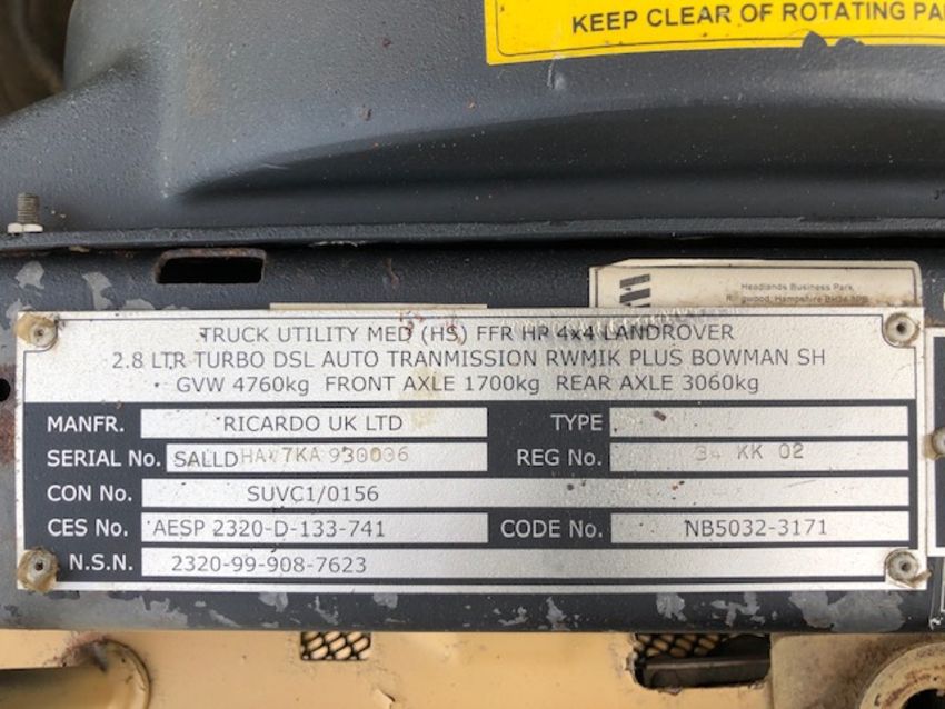 You are bidding on a recently released from the UK MoD a Land Rover RWMIK Plus. The vehicle is powered by a 2.8 Litre Turbo Diesel Engine and features an Automatic Gearbox. The speedometer shows 7,520km ( approx 4,600 miles only ). The first date into service was 12/10/1993.