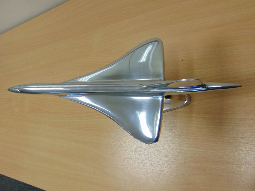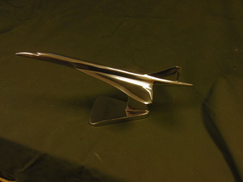 You are bidding for a beatiful polished Alluminum desk top mode of a Concord in flight on stand.