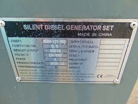 You are bidding on a 2020 UNISSUED 60 KVA 3 Phase Silent Diesel Generator Set. This generator is 3 phase 230/400 volt 50 Hz.