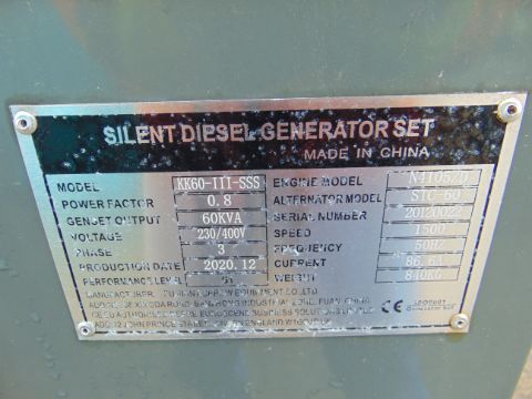You are bidding on a 2020 UNISSUED 60 KVA 3 Phase Silent Diesel Generator Set. This generator is 3 phase 230/400 volt 50 Hz.