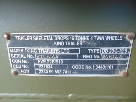 You are bidding on a King DB20 2 axle drawbar skeletal trailer Designed for carrying 20ft containers + military flat racks ISO twist locks 15ton capacity spring loaded drawbar  side storage lockers.
