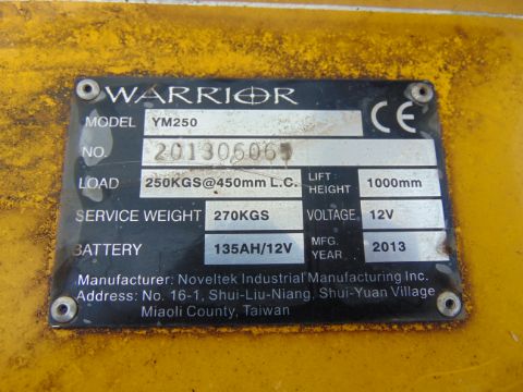 You are bidding on a 2013 Warrior YM250 Electric Lift Truck.