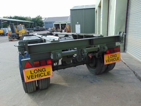 You are bidding on a King DB20 2 axle drawbar skeletal trailer Designed for carrying 20ft containers + military flat racks ISO twist locks 15ton capacity spring loaded drawbar side storage lockers.