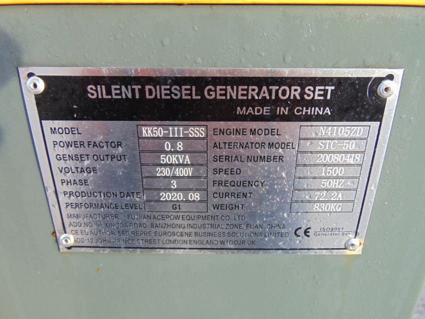 You are bidding on a 2020 UNISSUED 50 KVA 3 Phase Silent Diesel Generator Set. This generator is 3 phase 230/400 volt 50 Hz.