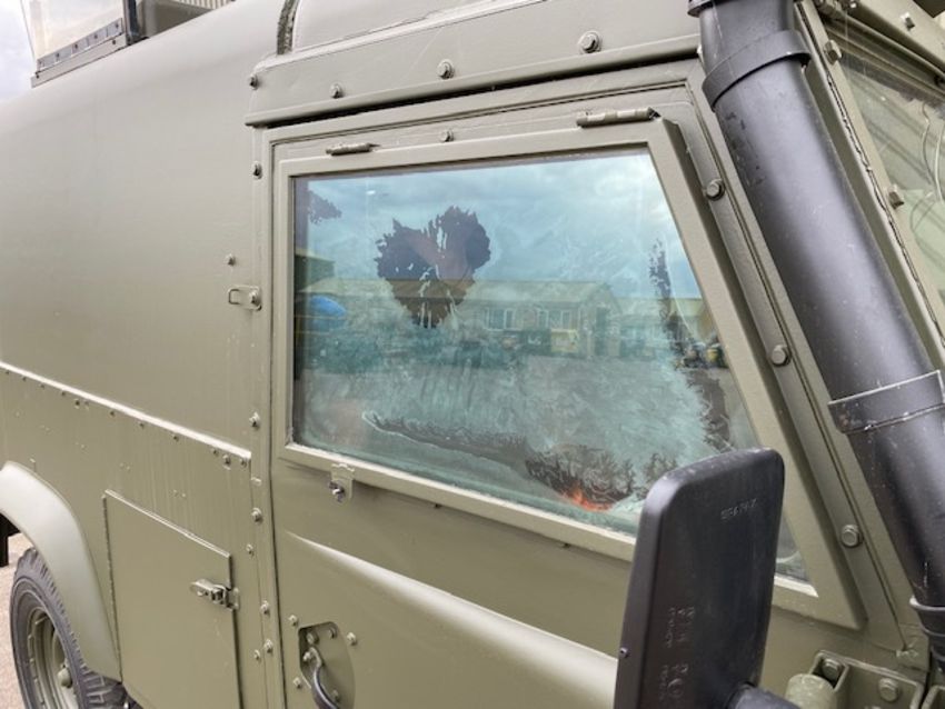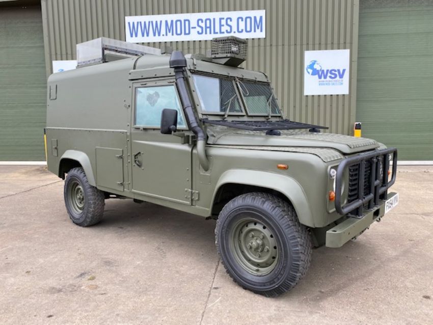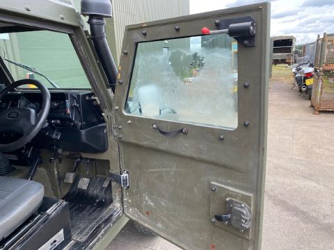 Land Rover Defender Snatch 2B 300Tdi armoured RHD, fitted 300TDi 2.5 litre turbo Diesel engine, R380 5 speed gearbox, Otokar ugraded chassis, power steering, bull bar, front mounted spare wheel, snorkel/high level air intake, remote controlled spot light, side lockers, front steering protector, Jate rings, sliding top hatch, rear seats, rear NATO tow hitch, Michelin 235/85R16 XZL tyres and Wolf heavy duty rims