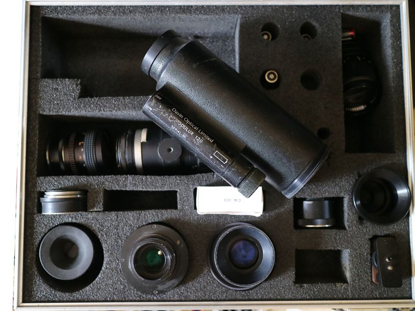 Davin Modulux image intensified full photographic kit with working 1st Gen Triple Cascade tube, in hard case with Nikon, Canon and CCTV C Mount accessories, allowing handheld and tripod mount, with lenses – VERY Rare Item – Fully operational NATO # 5855 99 788 8735 with a selection of lenses