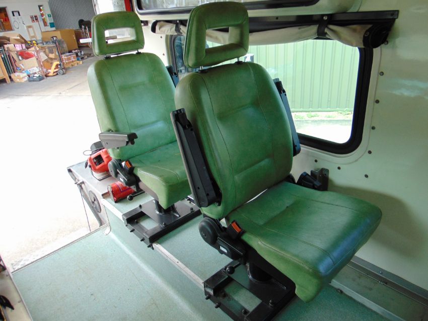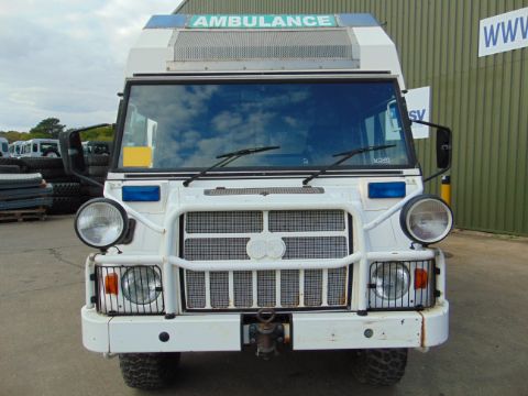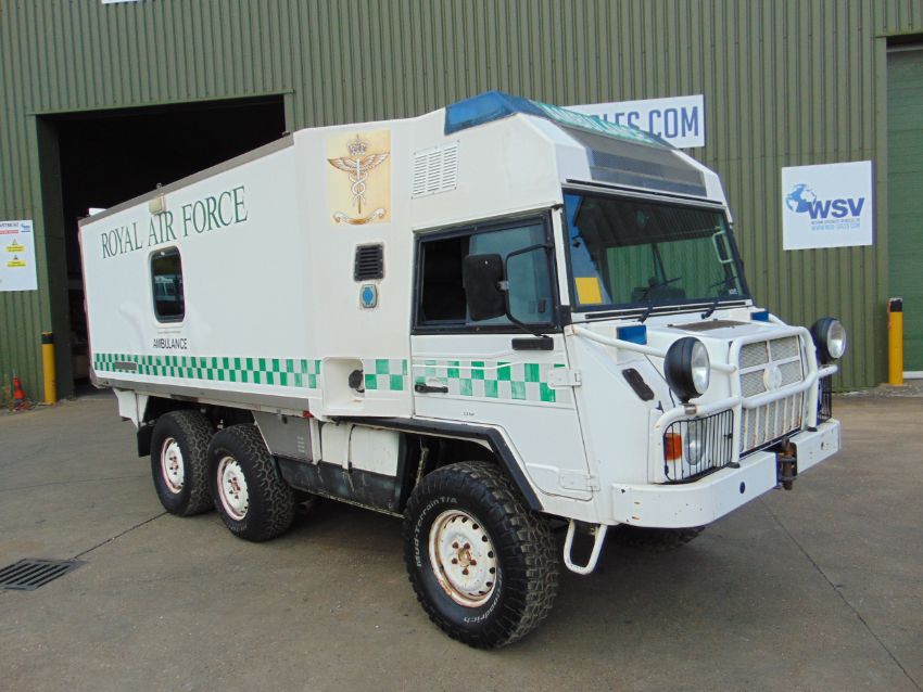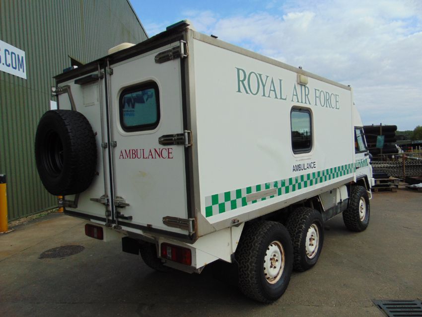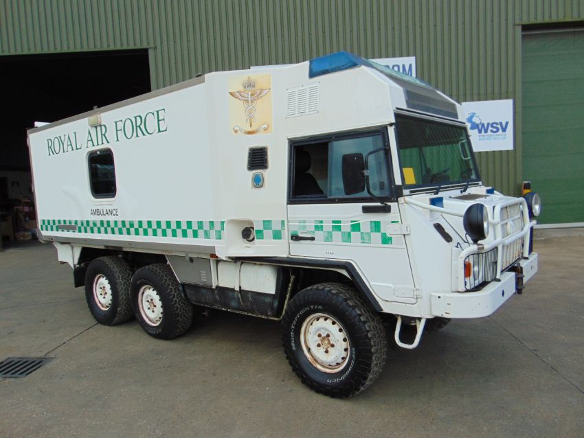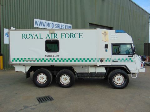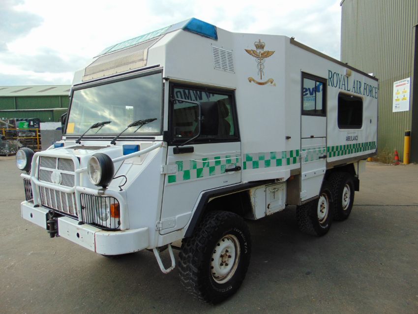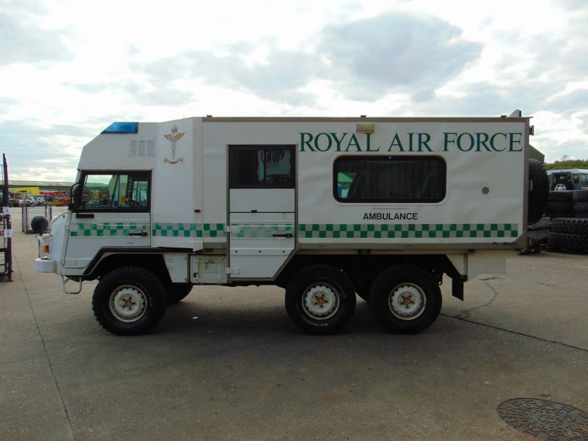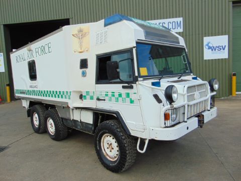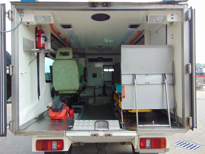 This Pinzgauer 718 6X6 features a fully insulated body with side door and twin rear doors. 6 cylinder 2.4 litre VW Turbo Diesel engine and 4 speed forward 1 reverse automatic transmission with high and low transfer box, front and rear differential locks, rear compartment with Rugged 500 lb capacity stretcher and 2x Jan Flex seats and 1x Medic seat, fully specced body to include lockers, cabinets, Denver air conditioning, Webasto Cab heater, interior lights 240v Engine pre heater system, Auto eject sockets, Horns, Sirens, Cibie driving lamps, map reading lights, etc, etc