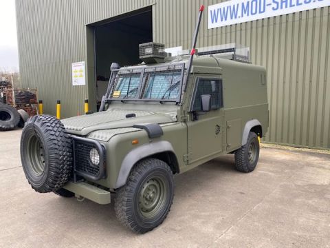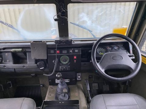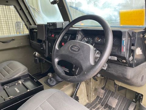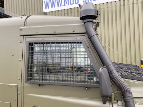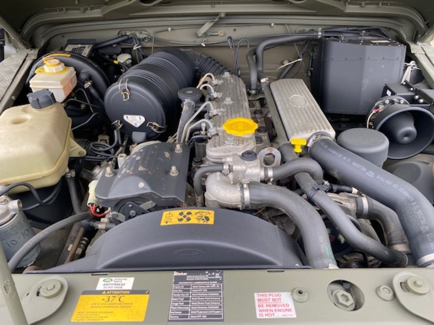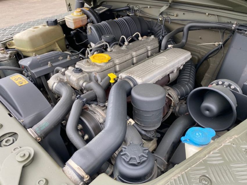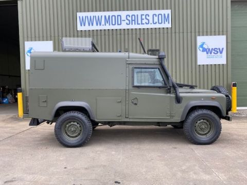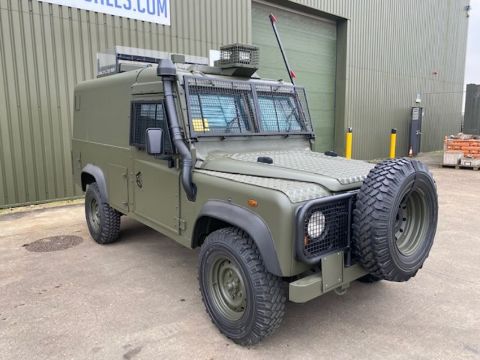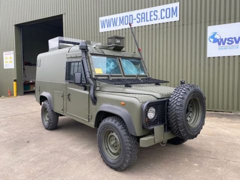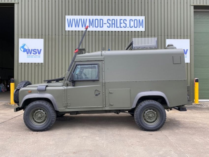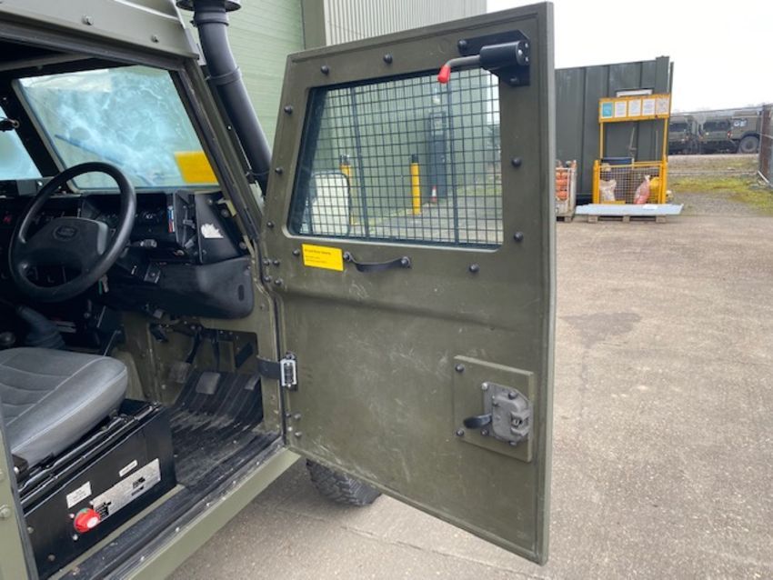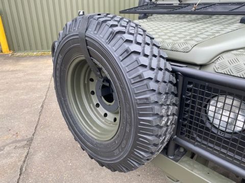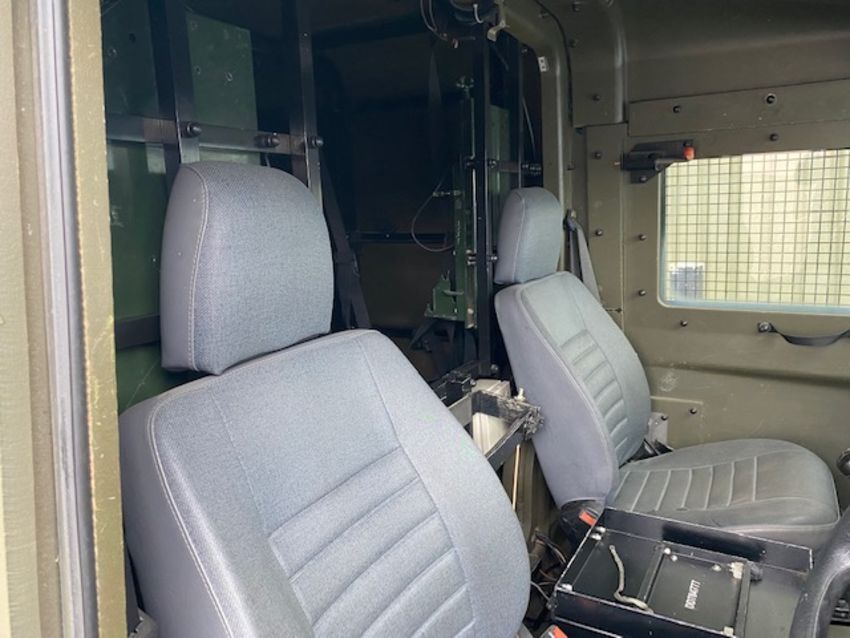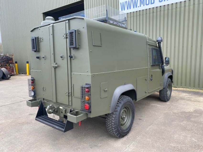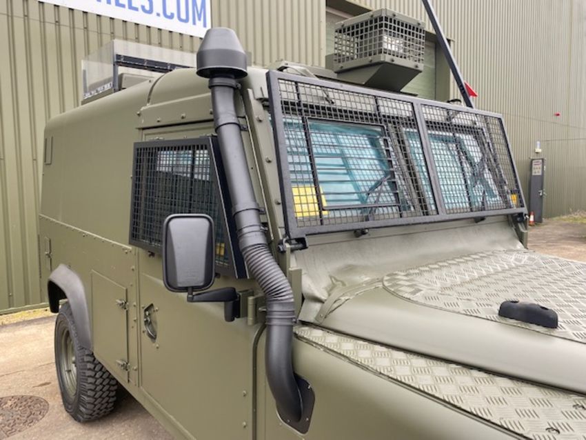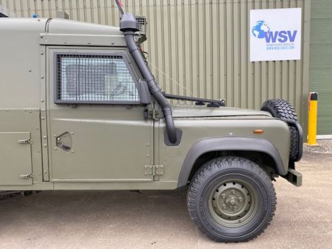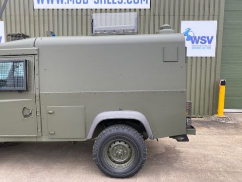 Land Rover Defender Snatch 2B 300Tdi armoured RHD, fitted 300TDi 2.5 litre turbo Diesel engine, R380 5 speed gearbox, Otokar ugraded chassis, power steering, bull bar, front mounted spare wheel, snorkel/high level air intake, remote controlled spot light, wire cutter, side lockers, front steering protector, Jate rings, sliding top hatch, rear seats, rear NATO tow hitch, Michelin 235/85R16 XZL tyres and Wolf heavy duty rims