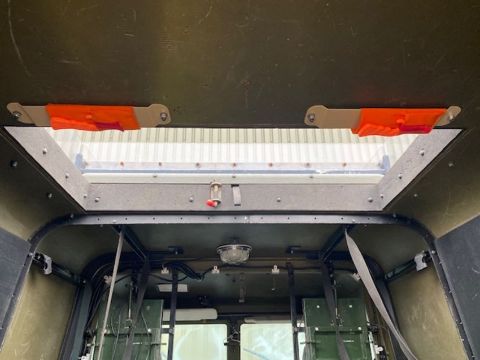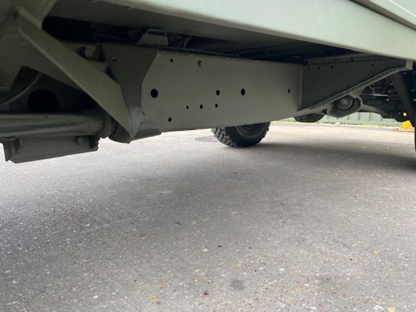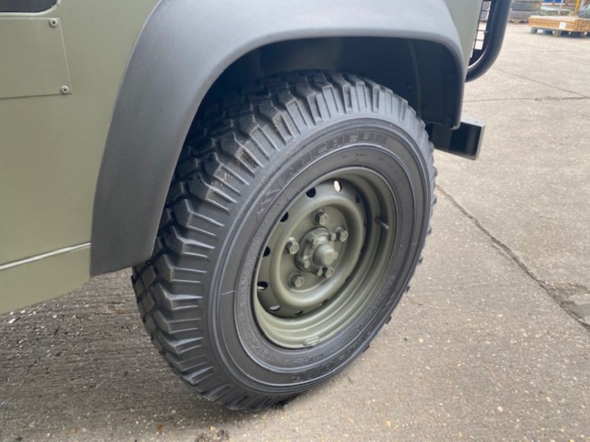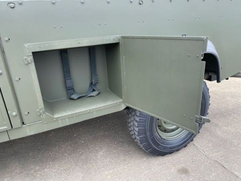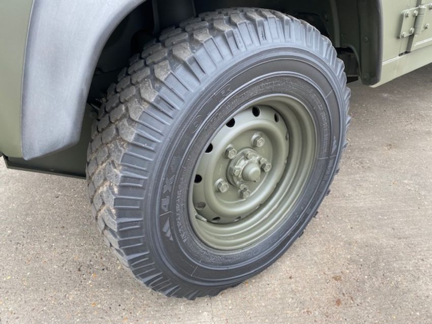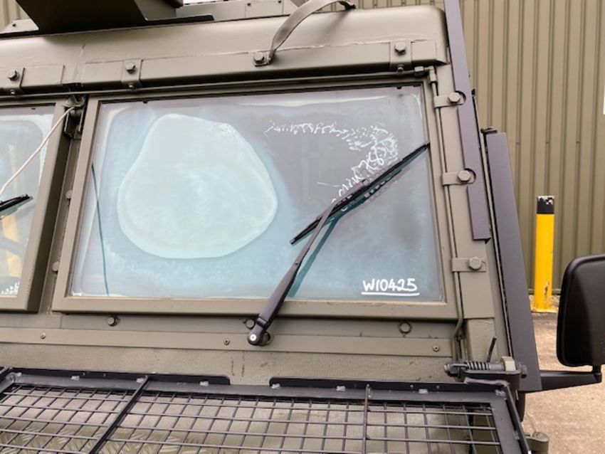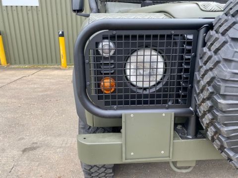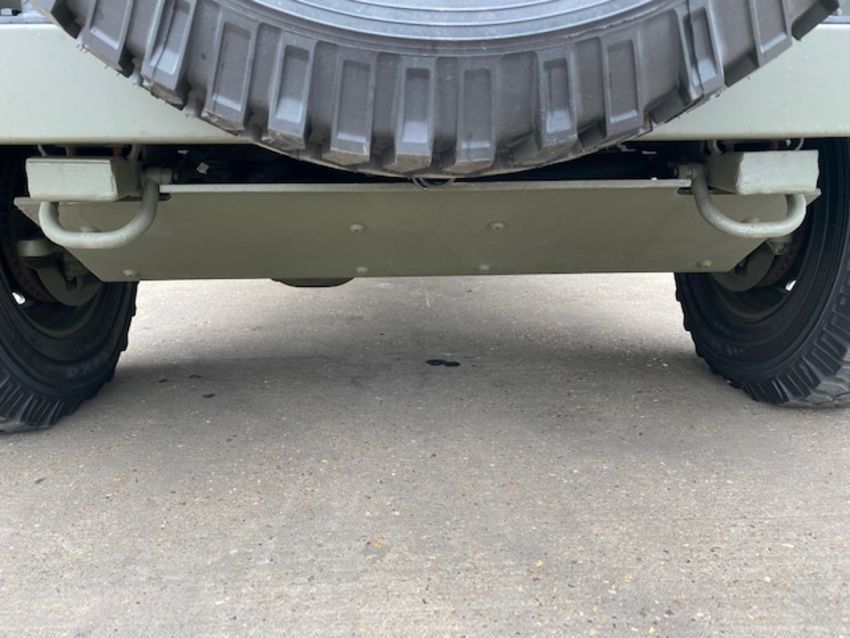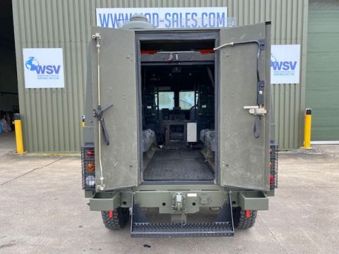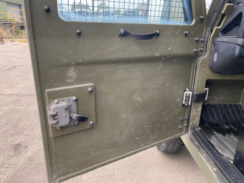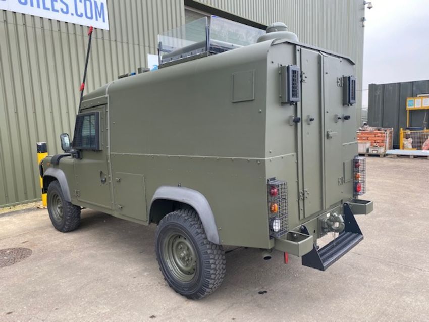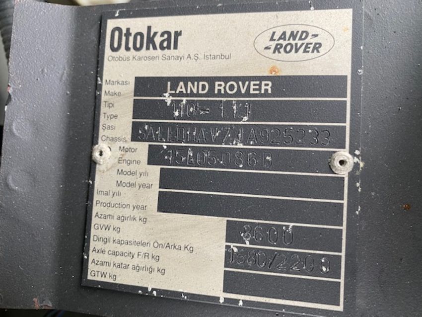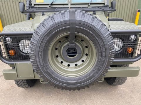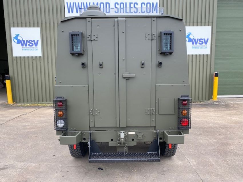 Land Rover Defender Snatch 2B 300Tdi armoured RHD, fitted 300TDi 2.5 litre turbo Diesel engine, R380 5 speed gearbox, Otokar ugraded chassis, power steering, bull bar, front mounted spare wheel, snorkel/high level air intake, remote controlled spot light, wire cutter, side lockers, front steering protector, Jate rings, sliding top hatch, rear seats, rear NATO tow hitch, Michelin 235/85R16 XZL tyres and Wolf heavy duty rims
