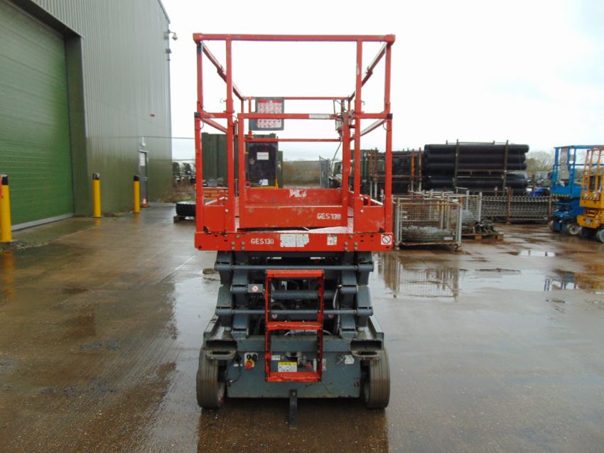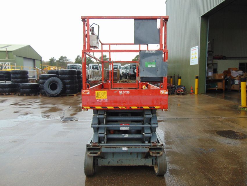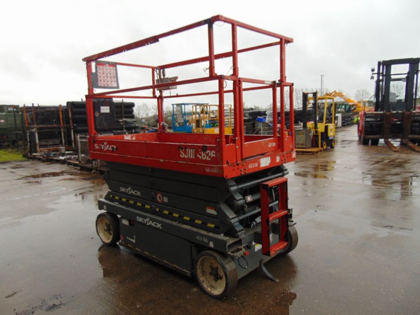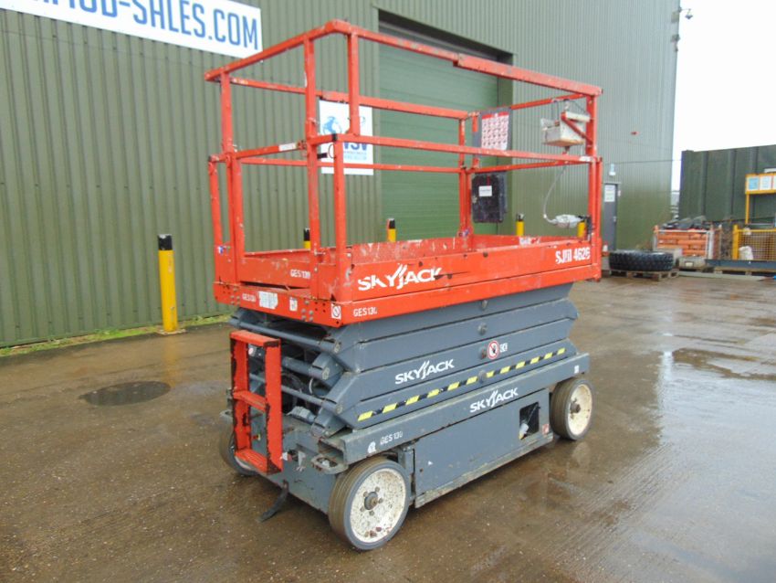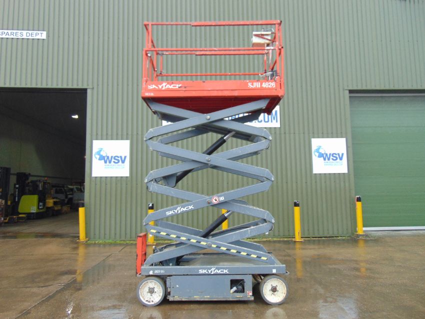 This SKYJACK SJIII 4626 Electric Scissor Lift Access Platform starts on the button lifts and drives as shown.