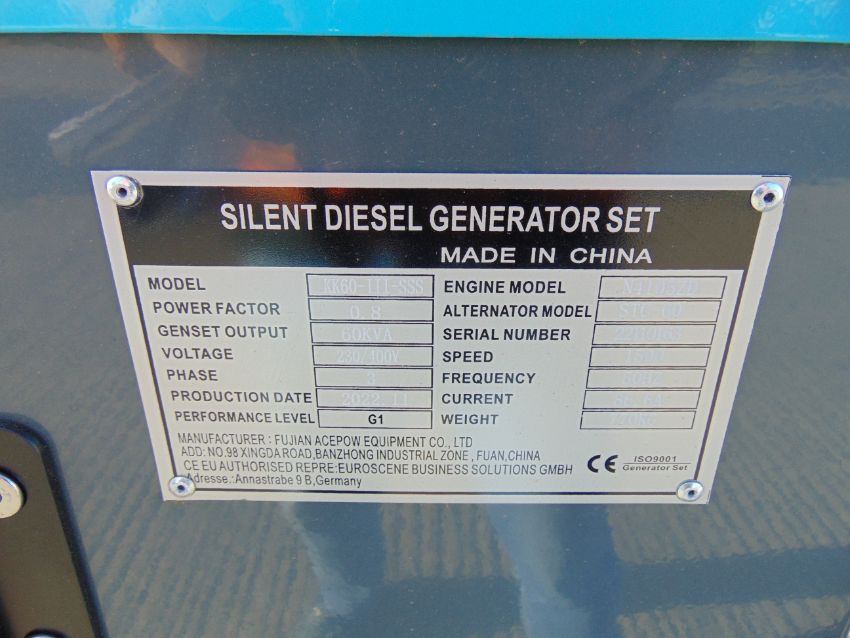 You are bidding on a 2022 UNISSUED 60 KVA 3 Phase Silent Diesel Generator Set. This generator is 3 phase 230/400 volt 50 Hz.