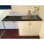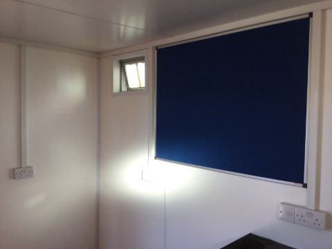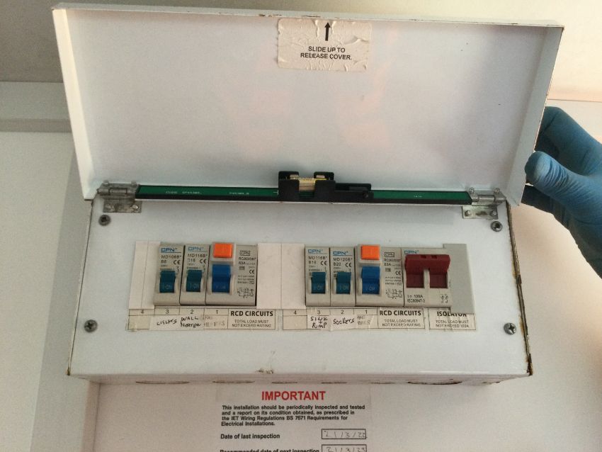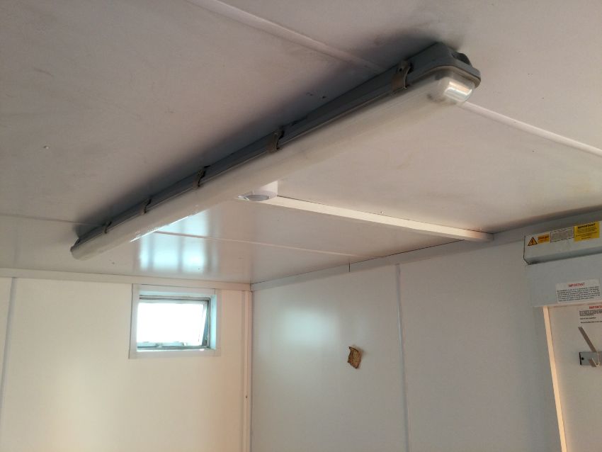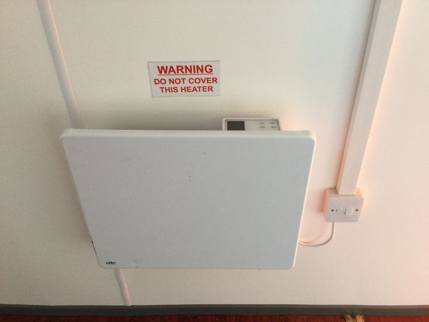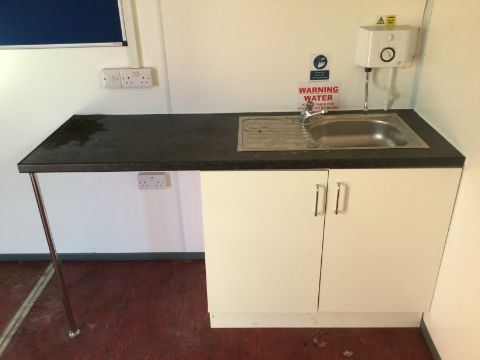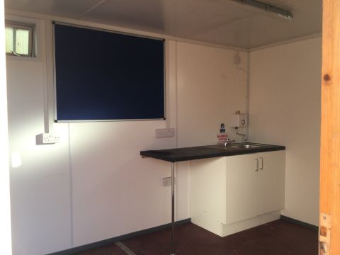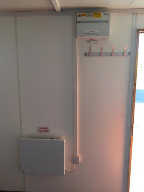 Modern refurbished interior including - heater, sink with drainage board, cupboard unit, small counter top, domestic UK 3-pin plug socket ports, ceiling lighting, fuse/curcuit board, coat hooks, pin board, 2 small frosted openable windows.