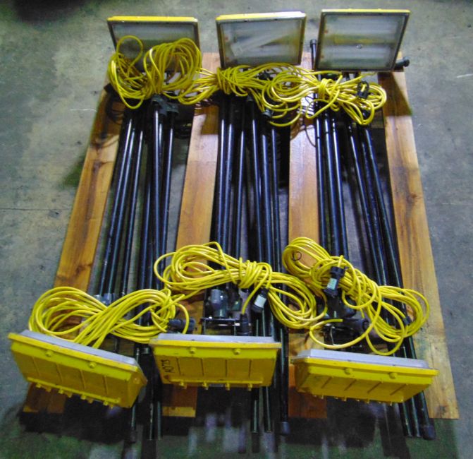 You are bidding on 6 x 110V Work Lights C/W Tripod Stands & Linking Cables.