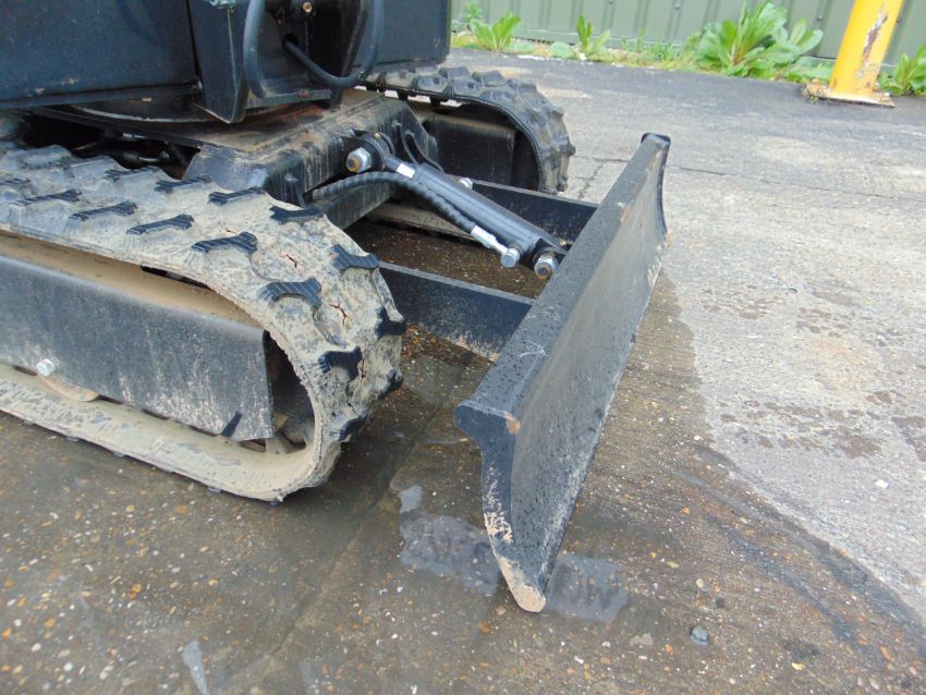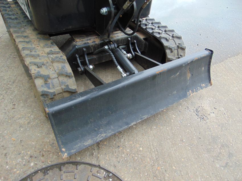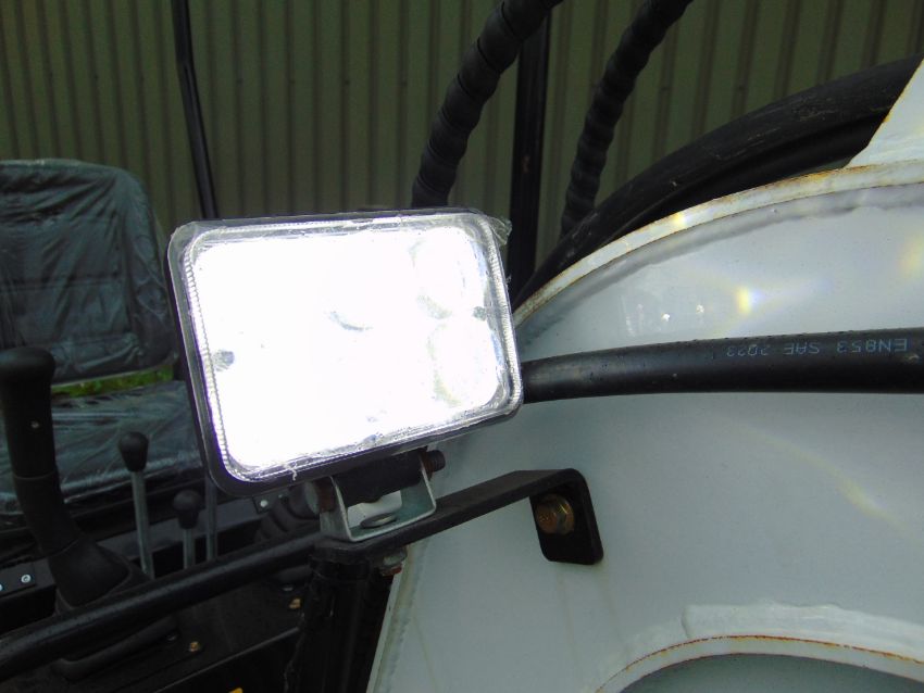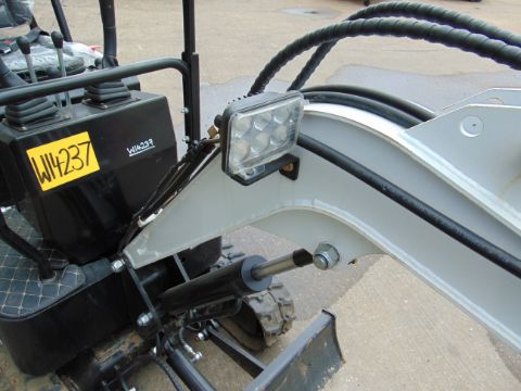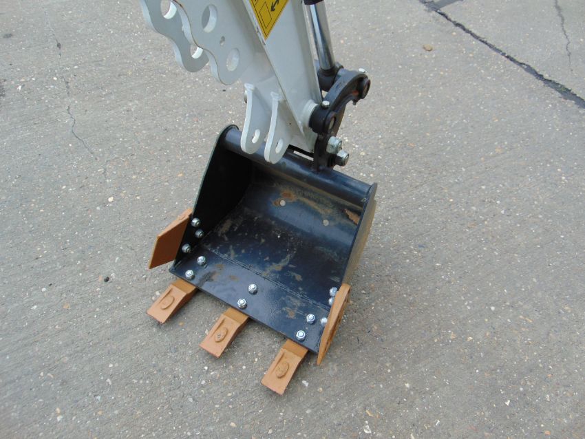 Excavator toothed bucket, adjustable front shovel blade, boom work light.