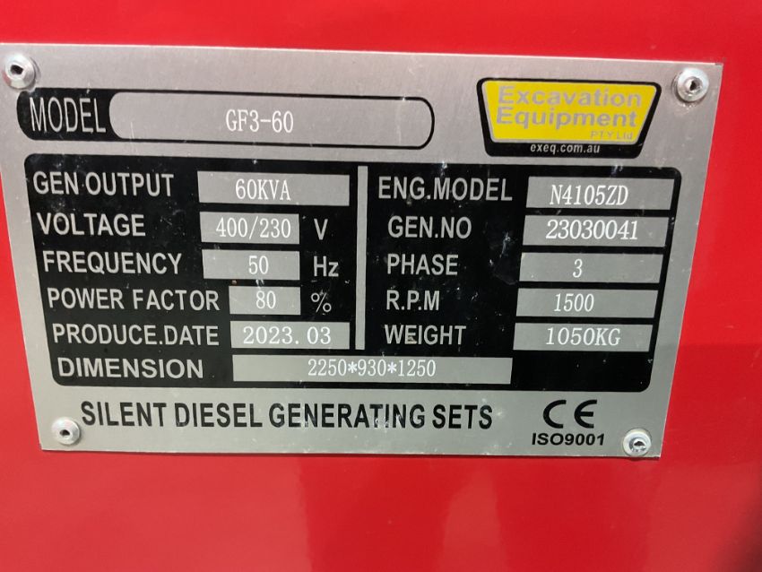 New Unissued 2023 GF 3 -60 60 KVA Diesel Generator 400/230 Volt 50 CPS 3 Phase and Single Phase.