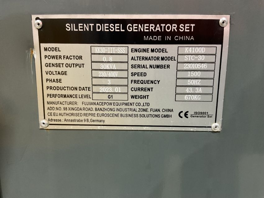 2023 New Unused 30 KVA Silent Diesel Generator - 3 Phase 230 / 400V.