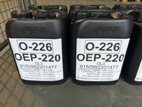 You are bidding on 8x 5 Litre Drums of OEP-220 extreme pressure industrial gear oil, unissued from MoD Reserve Stocks