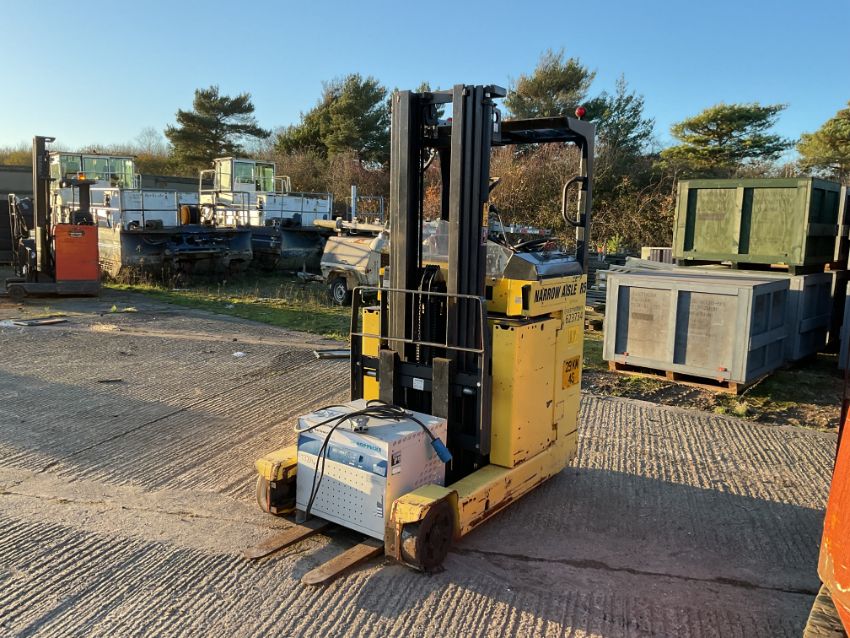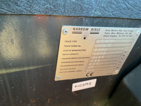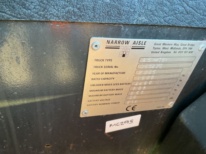 You are bidding on a Narrow Aisle R5-16N Triple Mast 1.6 ton Electric Fork Lift c/w Charger with side Shift etc, From MoD