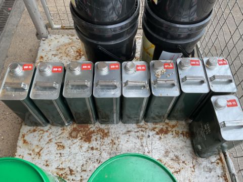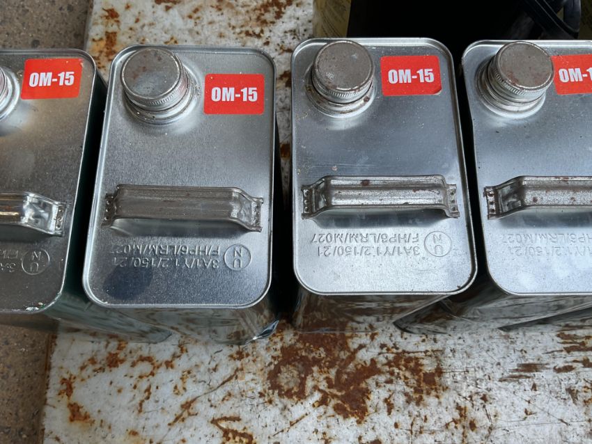 9x Unissued 5L Cans of OM-15 Hydraulic Oil Wide Temp Range and Oxidation Inhibitor, from MOD Reserve Stock